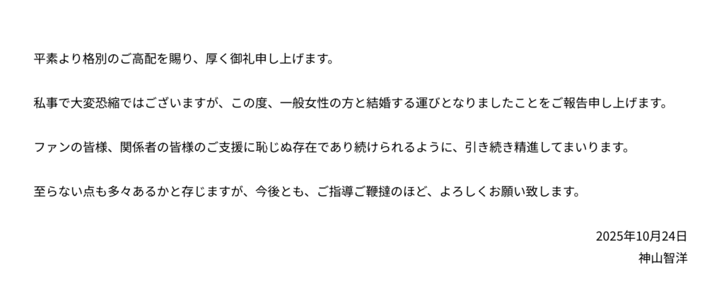 神山智洋さんは10月24日に結婚を発表しました。