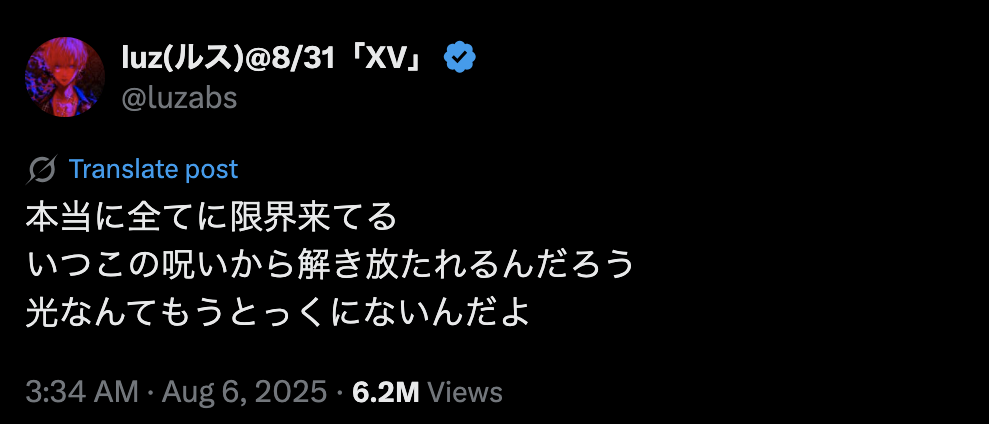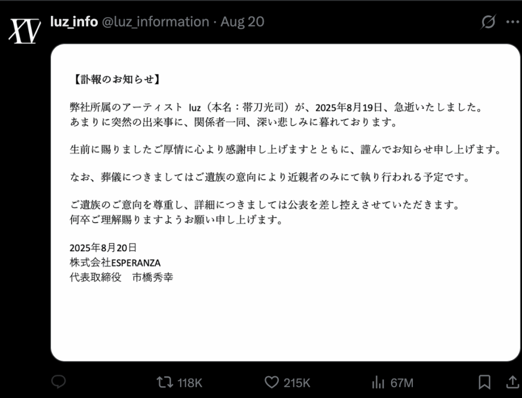 人気歌い手であるluzさんが2025年8月19に急逝したことが各メディアで報じられています。