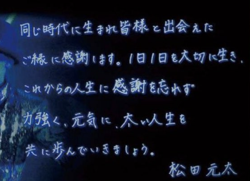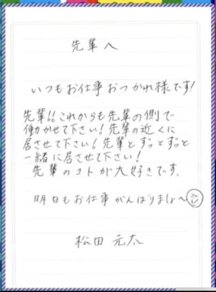 (前略)松田元太くん、「令和」がうまいと話題ですけど、習字習ってなくても見やすい字書ける男の子推せるし、そもそもわたしは「しんにょう」が上手な元太くんすごく推せた