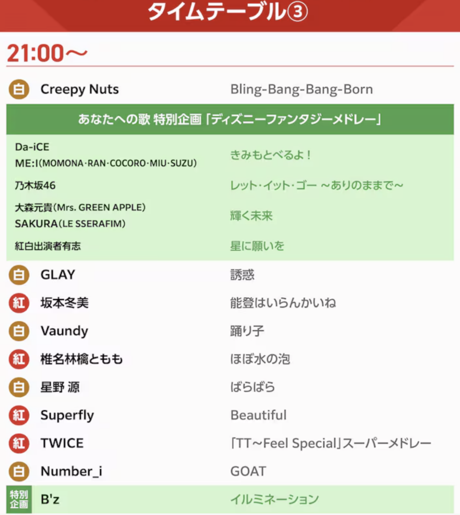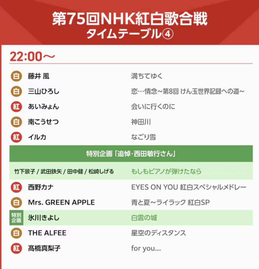 2024年の大晦日に放送された『紅白歌合戦』では、21時台に特別企画としてB’zが出演。22時台には特別企画『西田敏行さん追悼・もしもピアノが弾けたなら』を松崎しげるさんを含む4名で歌唱。