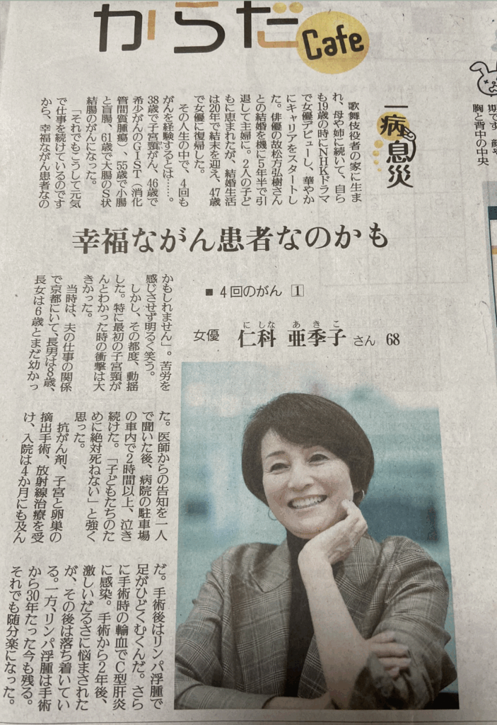 仁科亜季子さんは、4度のがんと皮膚がんの疑いを乗り越えてきました。