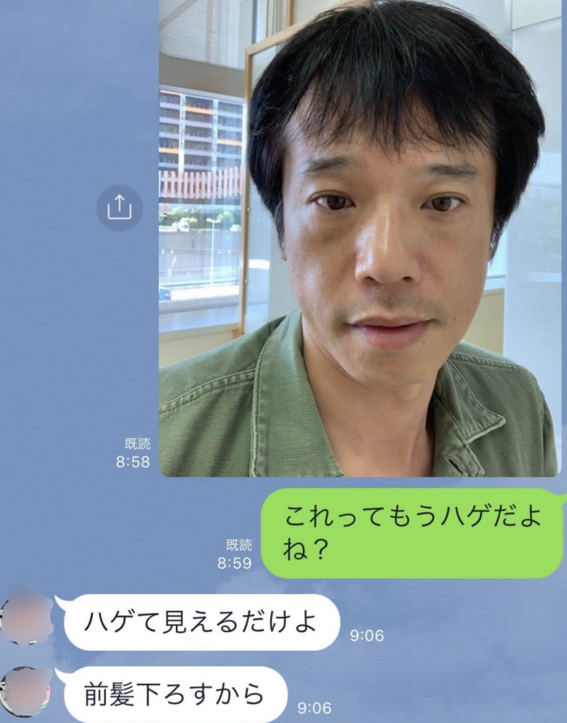 2019年5月24日の投稿では、奥さんであるミキティにLINEを自身のハゲについて送ってみると、