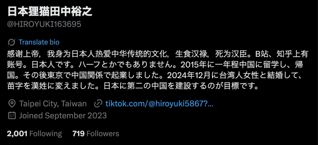 田中裕之さん自身は自分自身を日本人でありハーフではないと言っており、2015年に1年ほど中国に留学したとXのプロフィール欄で述べています。