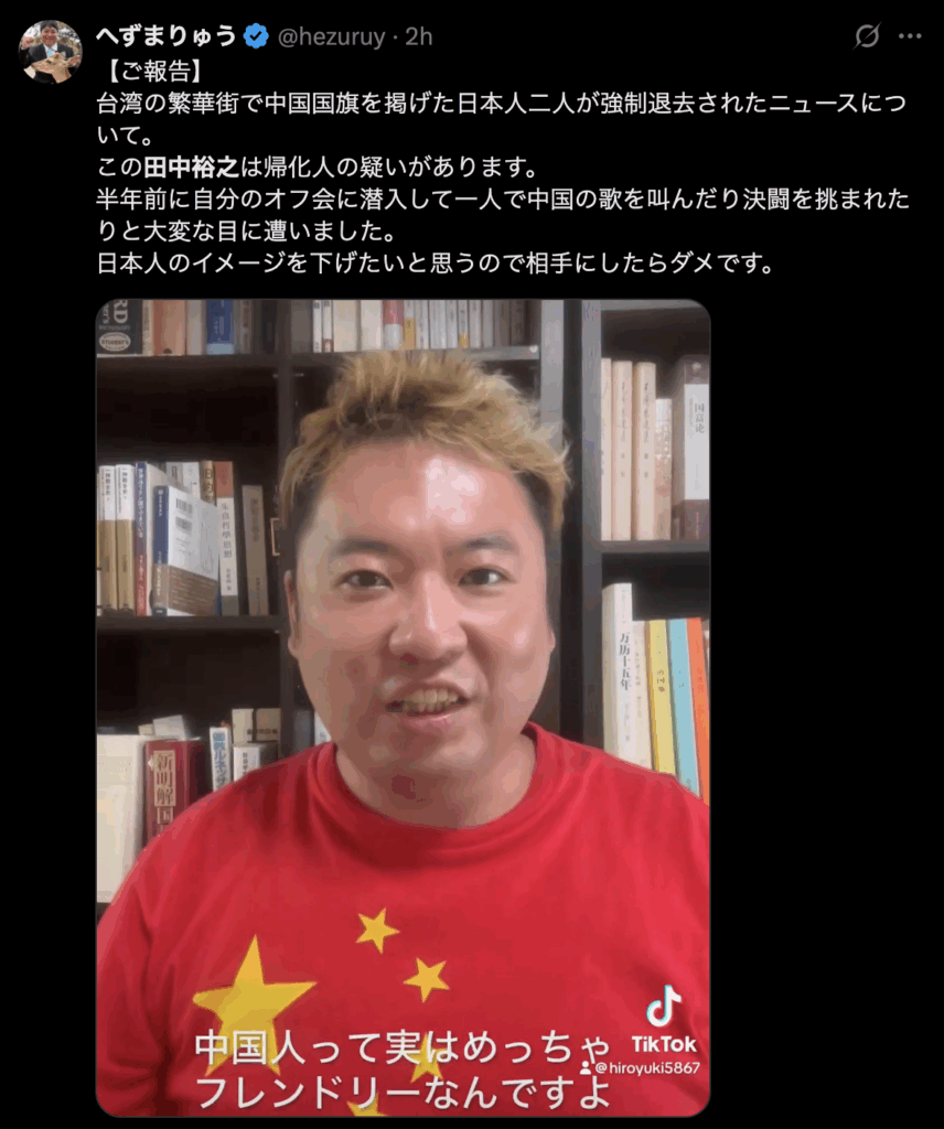台湾で突然中国の国旗を掲げ強制退去をさせられた田中裕之さんは、何者なのでしょうか。